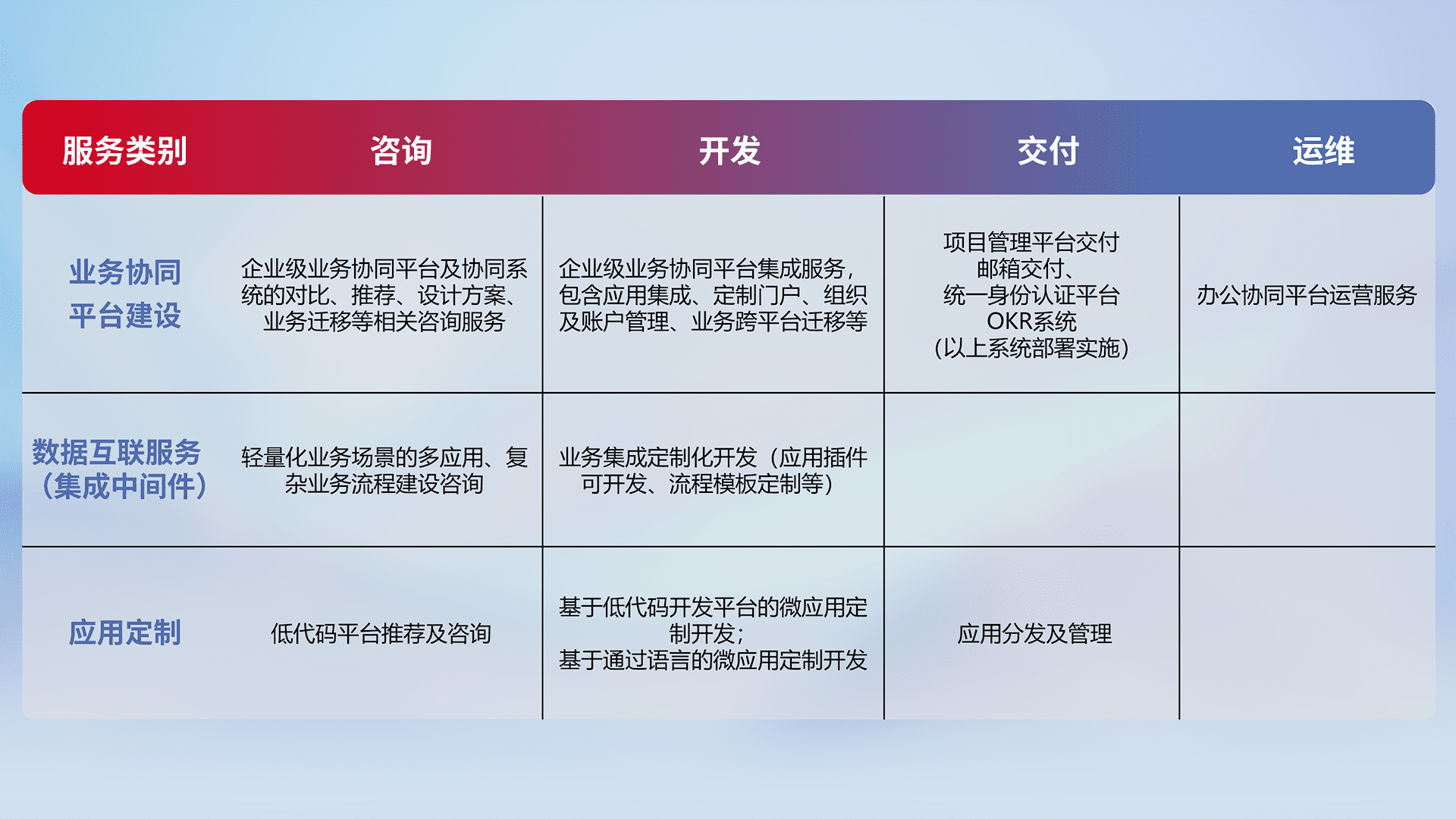针对钉钉、、、、企微、、、、IDaas等平台级产品提供产品的规划、、方案、、、、交付、、、、定制化开发等服务,,,,实现如统一协同办公、、智能客户服务、、、、混合会议管理、、、智能数据查询、、、等业务场景,,,实现数字化转型。。